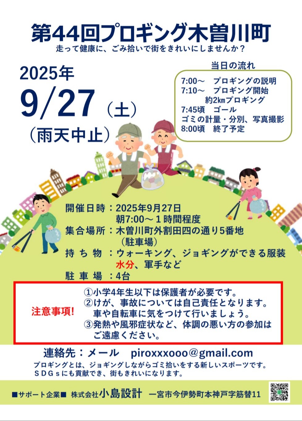 【開催】第44回プロギング木曽川町 日にち:令和7年9月27日(土) 時 間:あさ7時~8時頃 開催場所:一宮市木曽川町外割田四の通り5番地 駐車場:4台 往復約2㌔のプロギングを予定しています