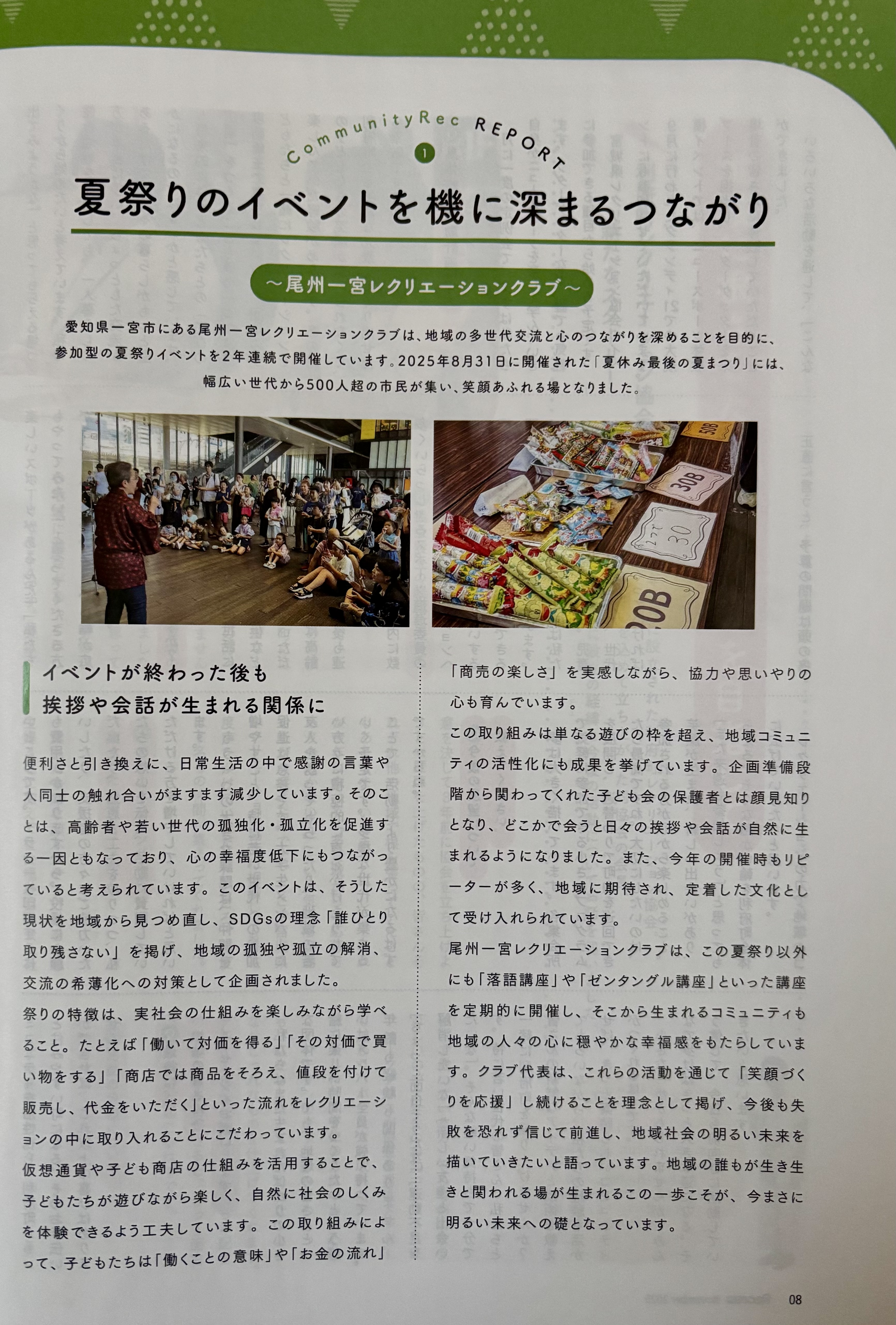 この度、尾州一宮レクリエーションクラブの活動が、 日本レクリエーション協会発行の「Recrew(レクルー)」11月号 「小さなコミュニティの輪が、まちの未来を紡いでいく」 特集に掲載されました。 特集内では、「夏休み最後の夏まつりイベント」での 取り組みが紹介されています。 日頃よりご協力・ご支援いただいている皆さまのおかげです。 心より感謝申し上げます。 今後ともよろしくお願いいたします。
