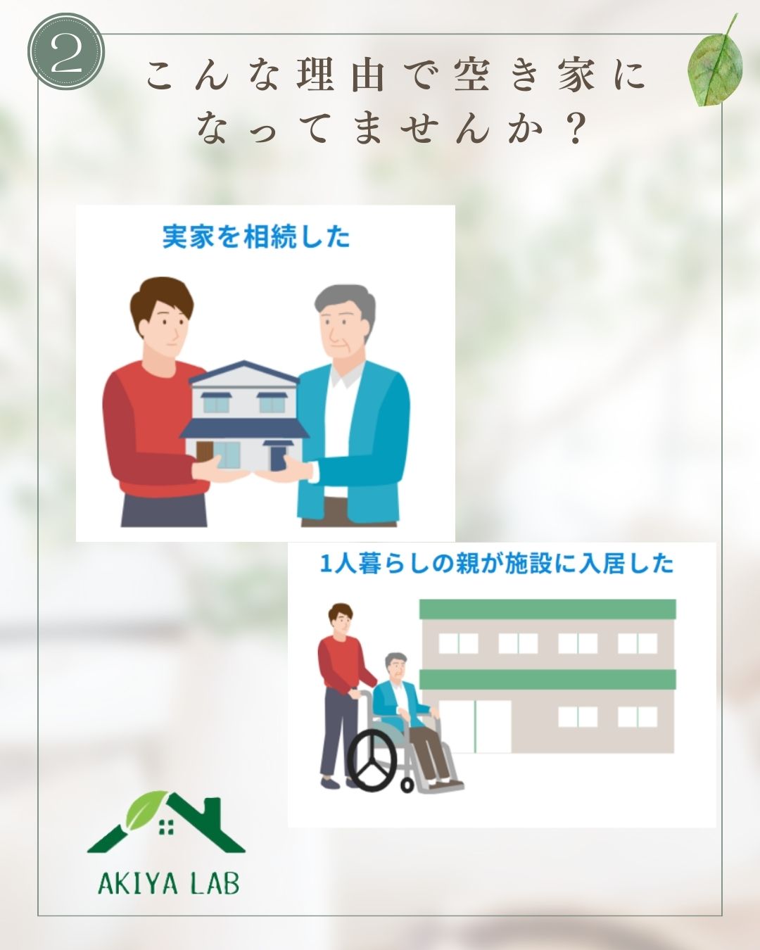 こんな理由で空き家になっていませんか? 実家を相続したが、誰も住む人はいなく放置してある 1人暮らしの親が施設に入居した為、空き家になり管理する人がいない その空き家は、草木や建物の管理ができないままになっていませんか? 空き家の管理で気になる点があれば、どんな小さなことでもご相談ください