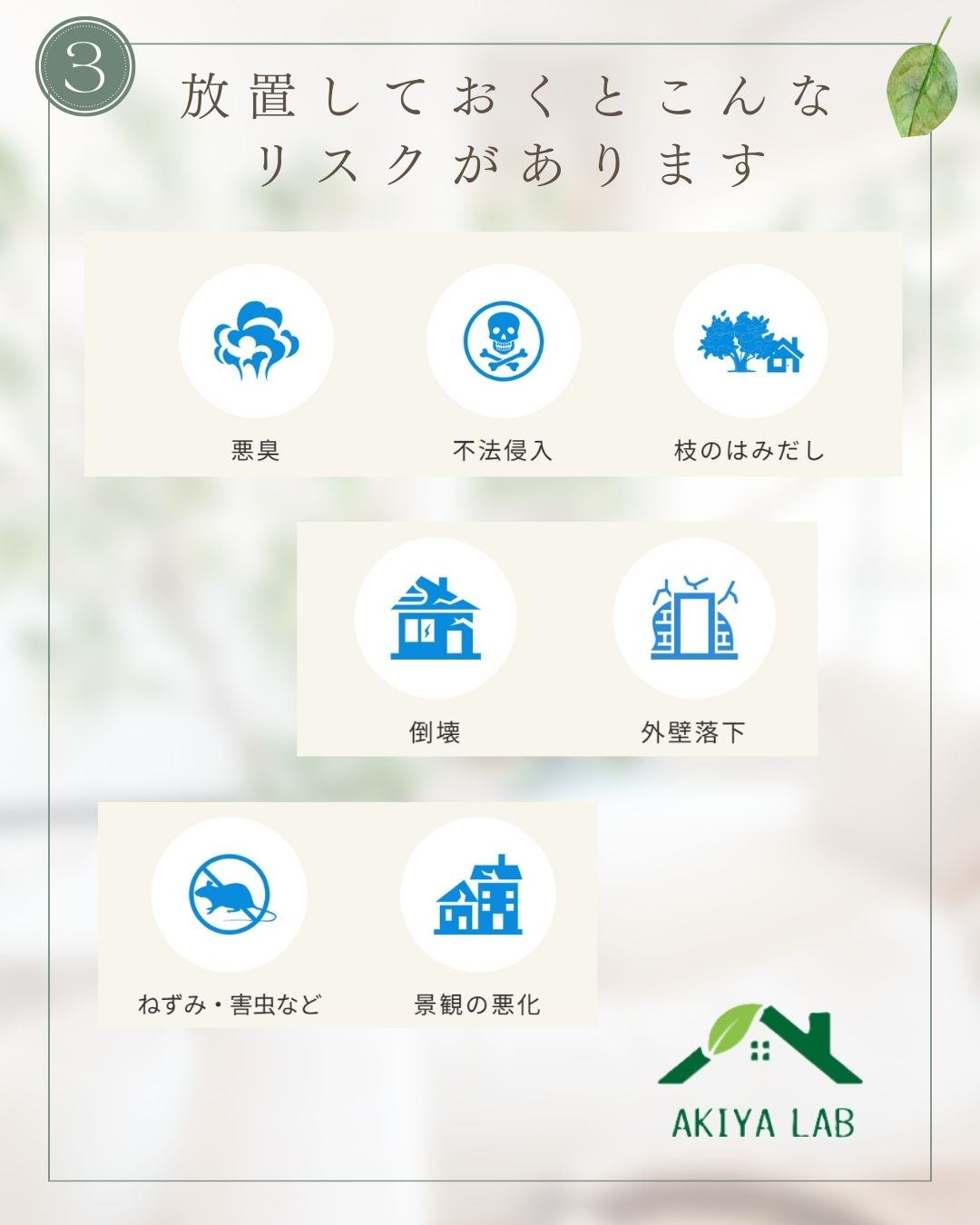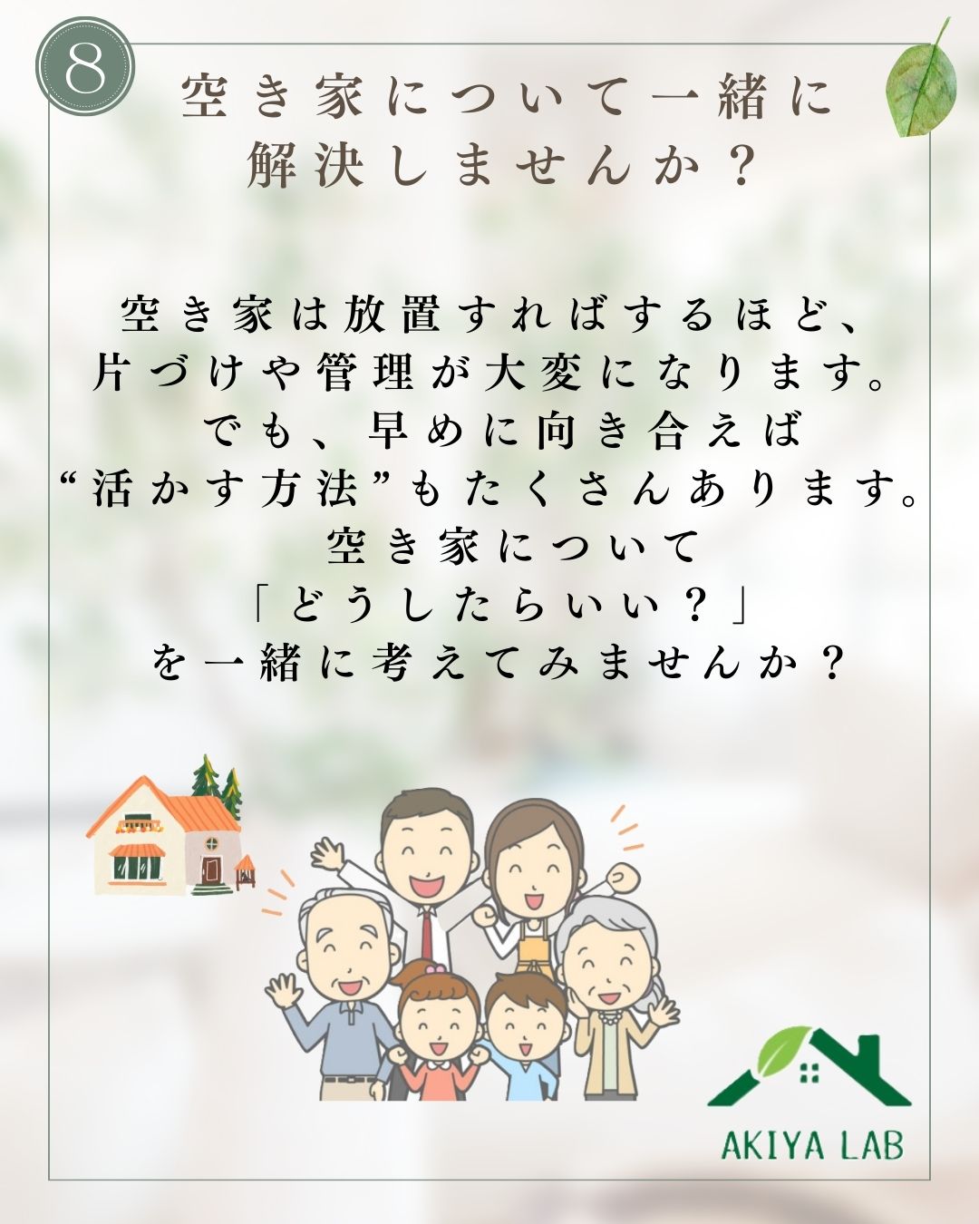 【空き家にはこんなリスクがあります】 枝のはみだし:庭木が成長して隣地へ枝がはみ出すと、近隣トラブルや通行の妨げになる可能性があります。 倒壊:建物の劣化が進むと、地震や台風の際に倒壊し、周囲に大きな危険を与える恐れがあります。 外壁落下:外壁材が老朽化して落下すると、通行人の怪我や車両の破損につながる可能性があります。 不法侵入:空き家は管理が行き届かないと不審者が侵入しやすく、犯罪の拠点になるリスクがあります。 景観の悪化:放置された空き家は街並みの景観を損ね、地域の価値を下げる要因となります。 ねずみ・害虫など:清掃や換気が行われない空き家では、害虫や害獣が繁殖し、近隣に被害を及ぼすことがあります。 空き家について一緒に解決しませんか? どんな些細なことでもご相談ください。