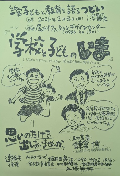 つどい0のテーマにある「学校と子どものいま」をテーマにパネリストの実体験を聞き、参加されたすべての方が、何かしら発言していただきたいと思っています。助言者として、名古屋芸術大学教育学部教授の鎌倉博先生にもお越しいただきます。