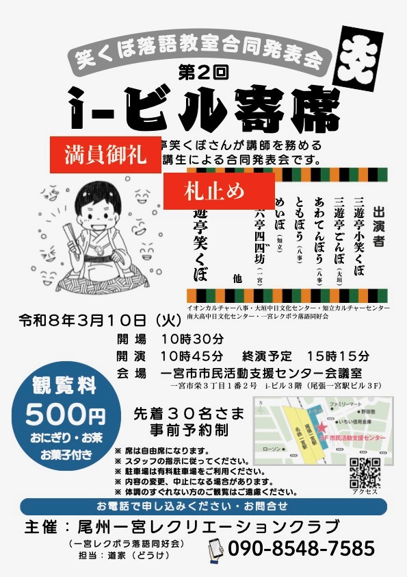 3月10日開催予定の 第2回i-ビル寄席は、 おかげさまで満員御礼となりました。 多数のお申込みをいただき、誠にありがとうございます。 またの機会に皆さまのご来場を心よりお待ちしております。