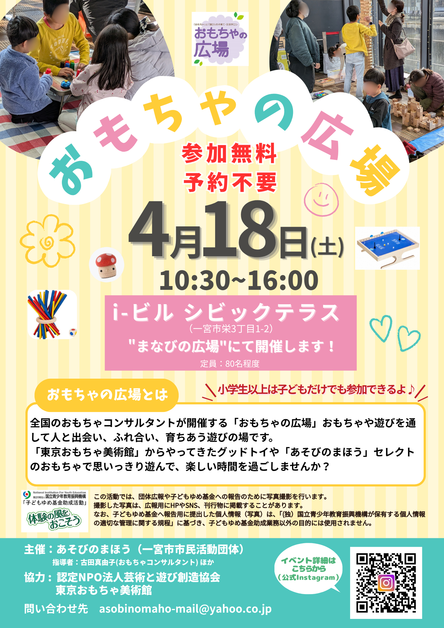日時 : 4月18日(土) 10:30~16:00 会場 : i-ビル 3階 シビックテラス(“まなびの広場”内にて開催) 参加料 : 無料(製作コーナーのみ有料) ※当日、直接会場にお越しください 「東京おもちゃ美術館」からやってきたグッドトイや「あそびのまほう」セレクトのおもちゃで思いっきり遊んで、楽しい時間を過ごしませんか? 今回は、“まなびの広場”内での開催!おもちゃの広場以外にも、楽しい体験ができるブースがいっぱいです!! 子どもはもちろん、おもちゃや遊びに興味がある方はどなたでもお気軽にご参加ください。