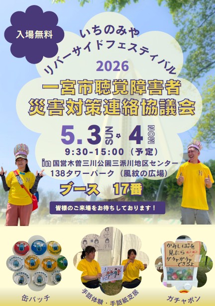 2026年5月3日(日)~5月4日(月・祝)の2日間、2026年第32回いちのみやリバーサイドフェスティバル(国営木曽三川公園三派川地区センター・138タワーパーク)に出展します。 |