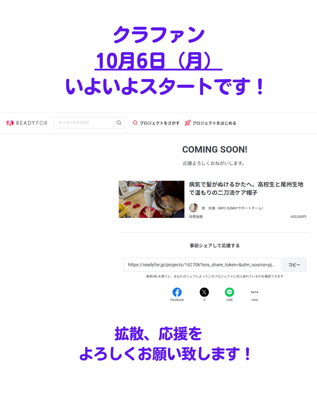 こんにちは!サニサポです。 私たちは、がん患者さんを支援する活動をしています これまでもケア帽子を作り、病院などへ寄贈してきました。 このたび【尾州生地×高校生×企業】と一緒に新しいプロジェクトをスタートします! その資金を集めるため、クラウドファンディングを始めます。 クラファンは、インターネット上で少しずつ応援を集める仕組みです。 ぜひ一緒にこの活動を広げていただけませんか? クラファンページはこちらです。 リンク よろしくお願い致します。