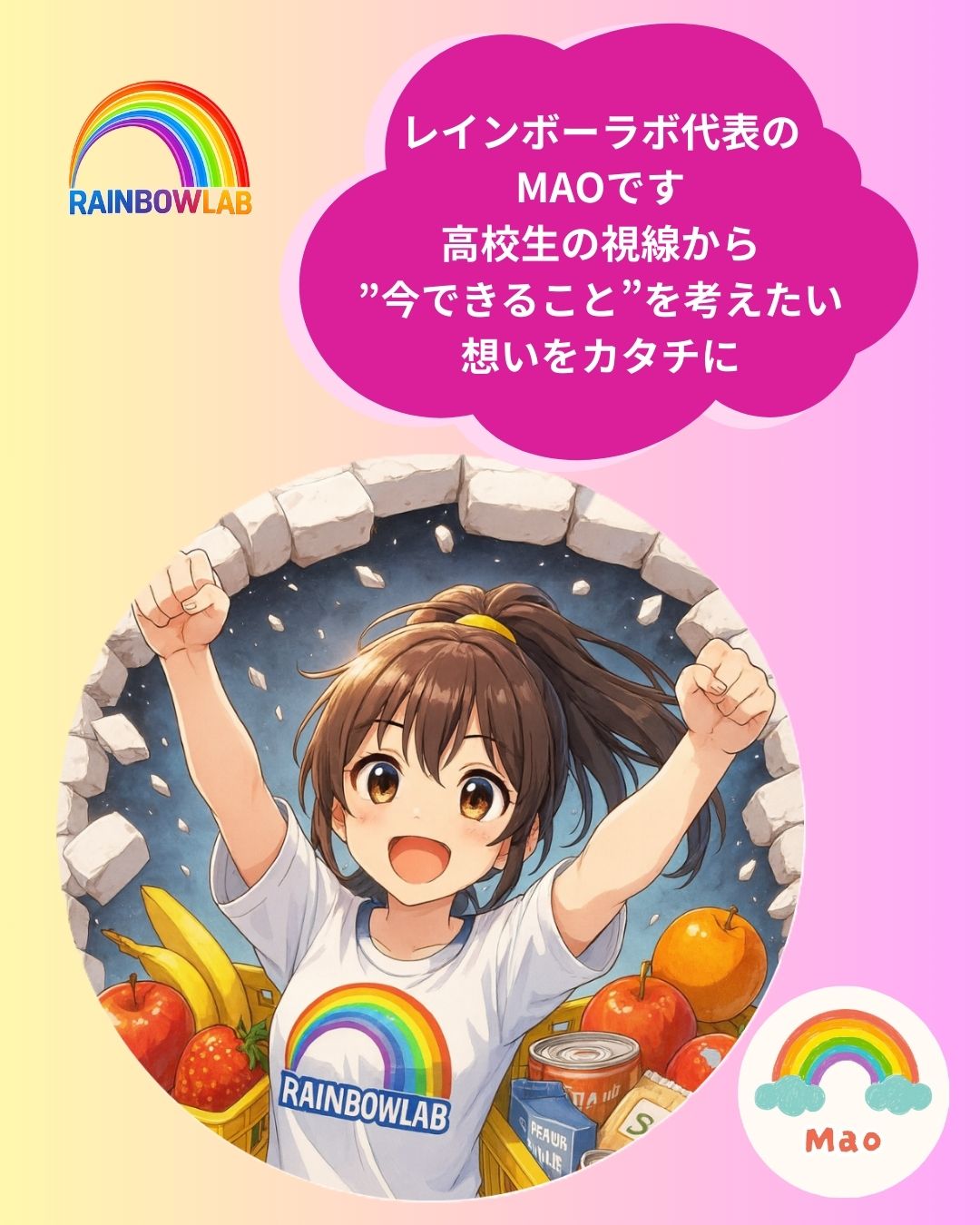 高校生が立ち上げた市民活動団体「レインボーラボ」です。 一宮市を拠点に、食品ロスやフードバンクの活動を発信。 まずは、地域の中にこうした活動があることを知ってもらうことから。 まだ食べられるのに捨てられてしまう食品と、 支援を必要としている人をつなぐ取り組みや、 身近にできるフードドライブなどを紹介。 これから活動の様子や地域の情報も発信していきます。 よろしくお願いします。